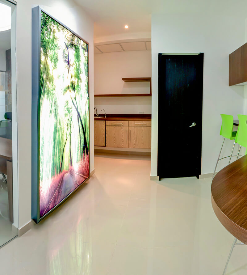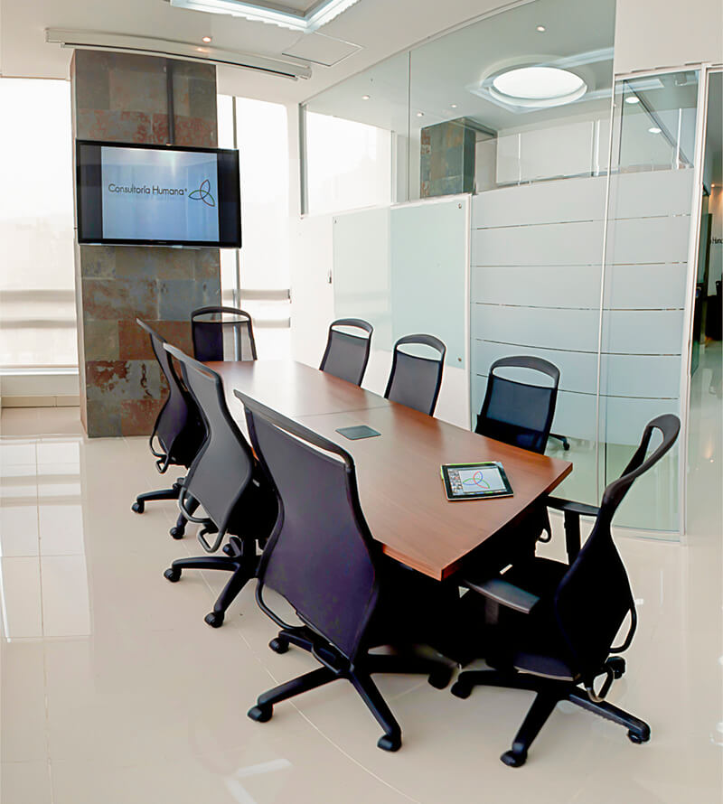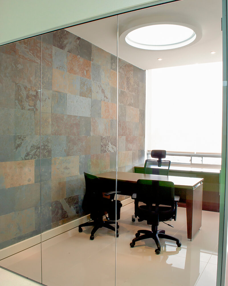 Los detalles en vidrio y la iluminación permiten dan la sensación de un entorno cálido y seguro, los tonos tierra y la decoración aportan el toque natural de elegancia y conocimiento al lugar; mobiliario con acabados en chapilla natural realzan las formas del diseño.