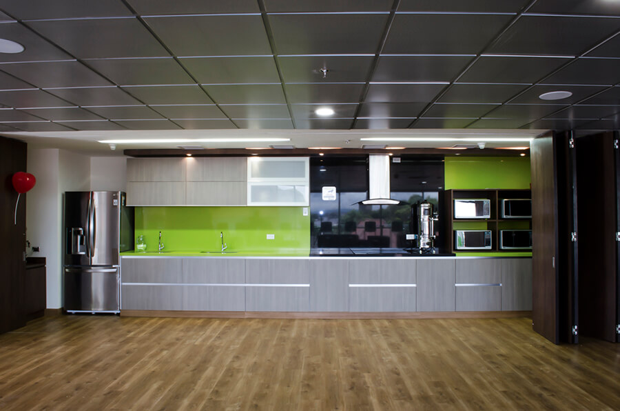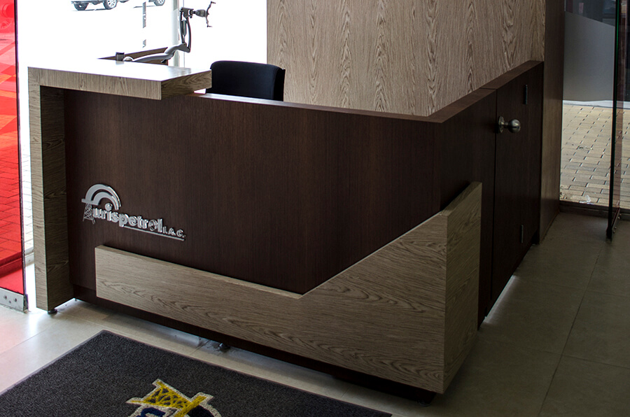 Pisos en tapete modular diseñados e instalados bajo parámetros de funcionalidad, pensados para generar una percepción de “bienvenida”. Mobiliario en cuero, techos con acabados en madera, planeados para marcar una sensación de hogar, además de remates en columna y backing de recepciones con una exaltación evidente de los valores de la compañía.