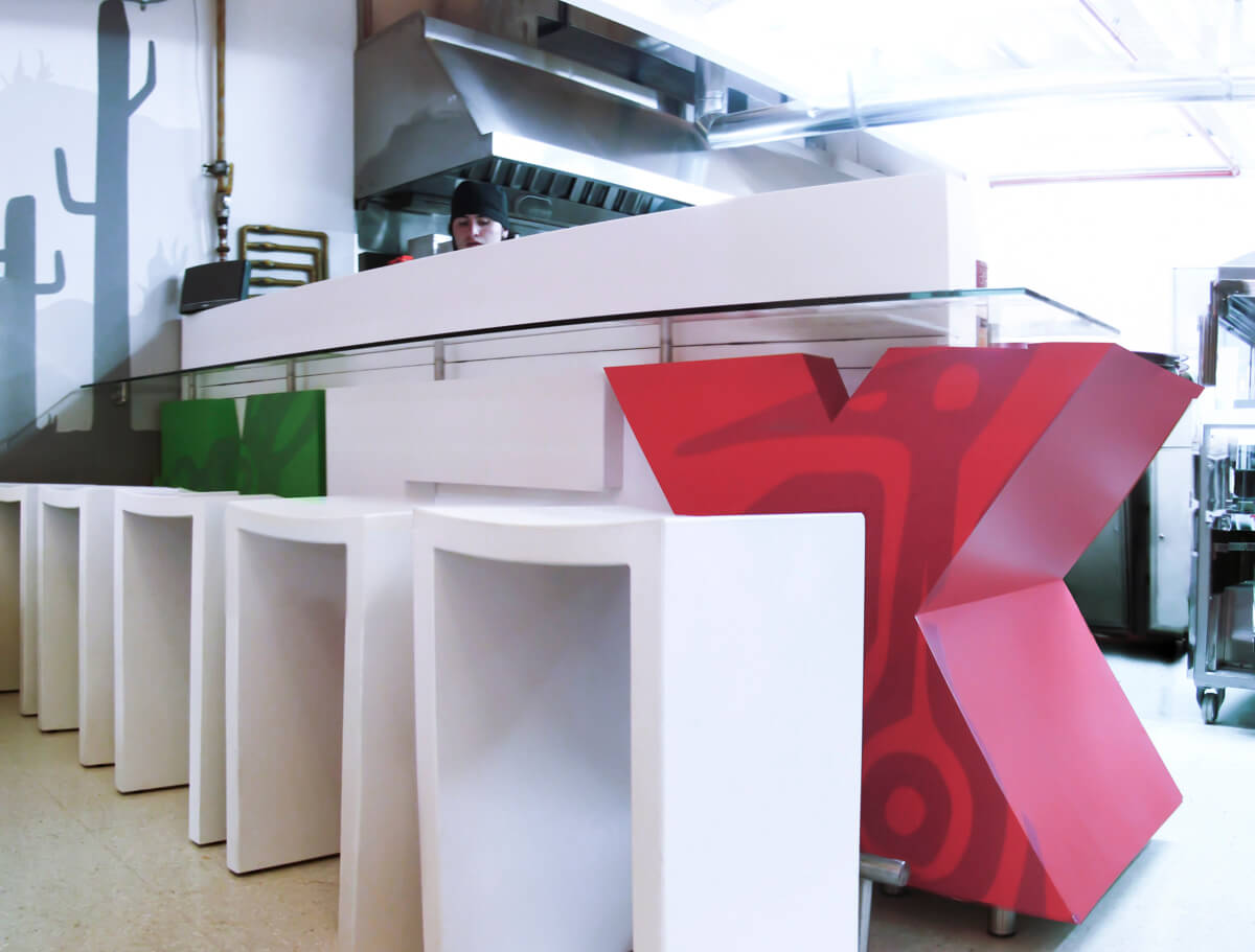 Con pictogramas típicos, como principal recurso gráfico y de identidad, se intervinieron las paredes a través de un impecable corte laser sobre mdf y sellamiento con vinilo acrílico, que dejan ver la cultura mexicana con un alto nivel de sofisticación y dinamismo. Colores vibrantes e intensos para el mobiliario, planeados exclusivamente para lograr un equilibrio general del espacio.