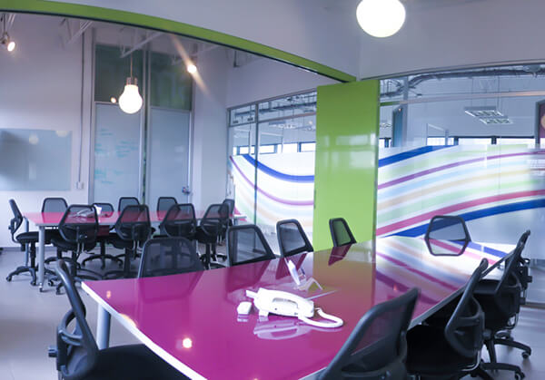 Formas cúbicas para personificar la autenticidad. Divisiones de vidrio que permiten una sensación de libertad y amplitud, además de otorgarle protagonismo a los espacios naturales. Biombos que dividen las salas de juntas y facilitan una distribución adecuada. Vinilos alegres y decorativos que mantienen la privacidad de las oficinas. Techos descubiertos para ganar altura y generar una percepción de naturalidad.