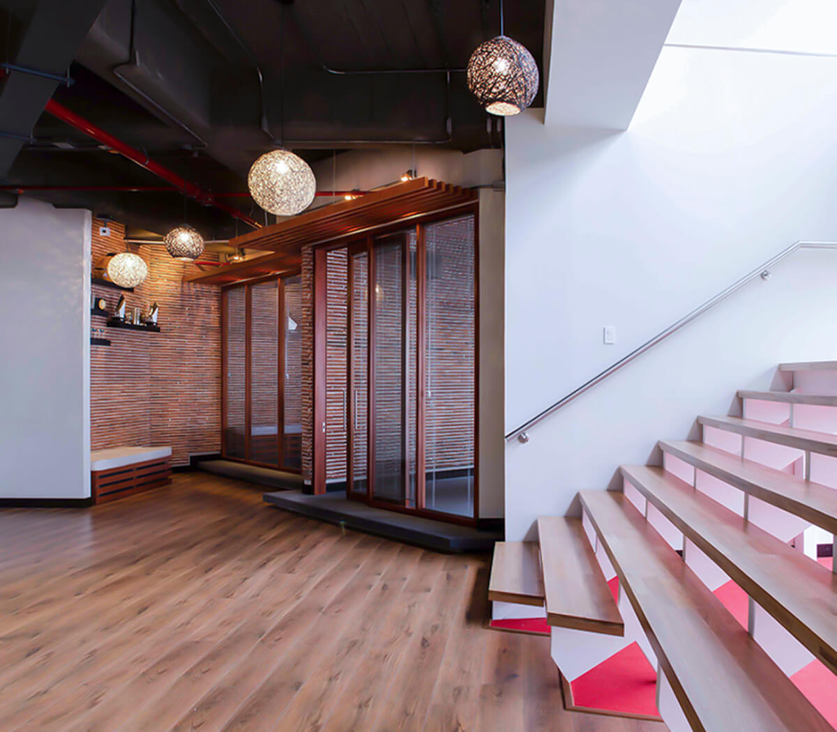 Transfer en los vidrios y columna revestida en pintura acrílica que transmiten la identidad y el lenguaje único de la agencia. Recepción proporcionada, armoniosa y pensada para la mejor “primera impresión”. Acabados de las paredes en vinilo y enchapes en listello; pisos que engalanan cada paso con una combinación en madera y tapete. Escalera con la versatilidad de convertirse en gradería y punto de encuentro.