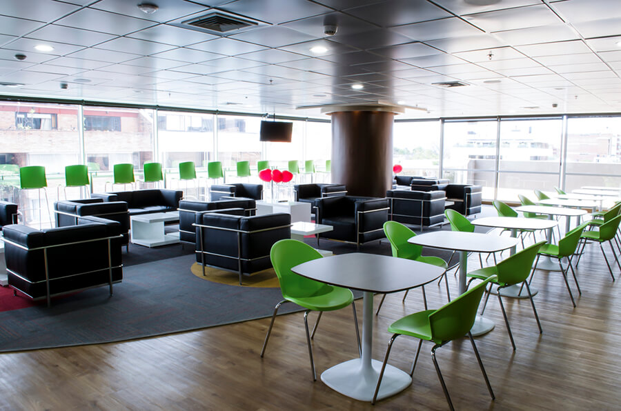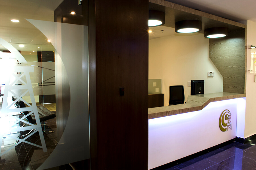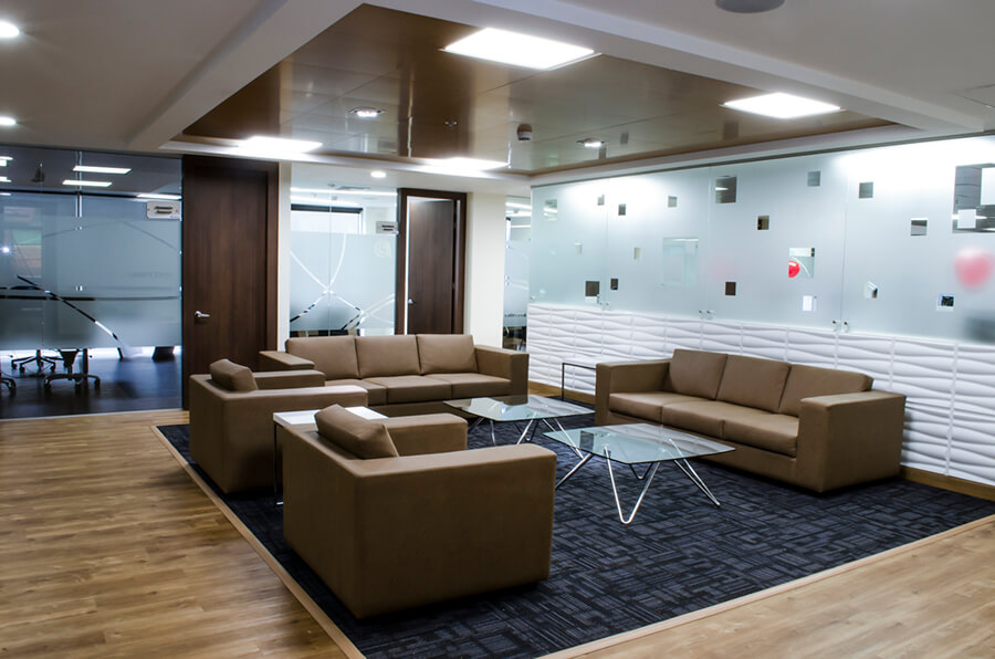 Pisos en tapete modular diseñados e instalados bajo parámetros de funcionalidad, pensados para generar una percepción de “bienvenida”. Mobiliario en cuero, techos con acabados en madera, planeados para marcar una sensación de hogar, además de remates en columna y backing de recepciones con una exaltación evidente de los valores de la compañía.