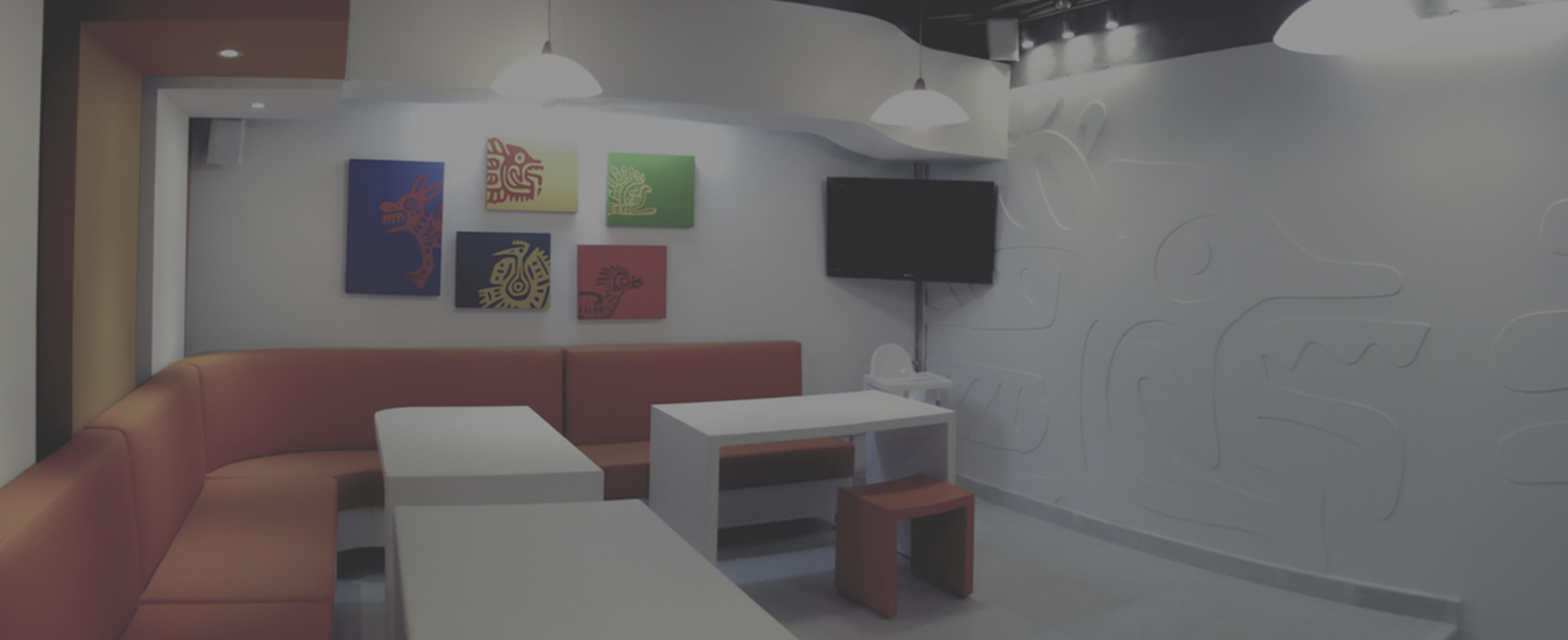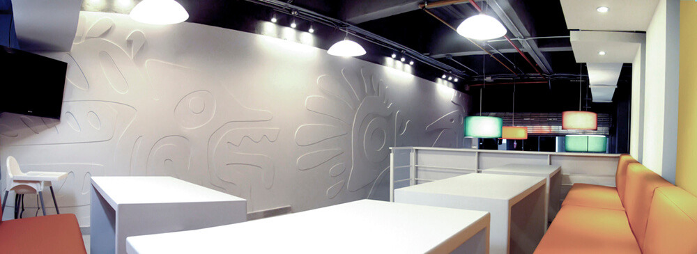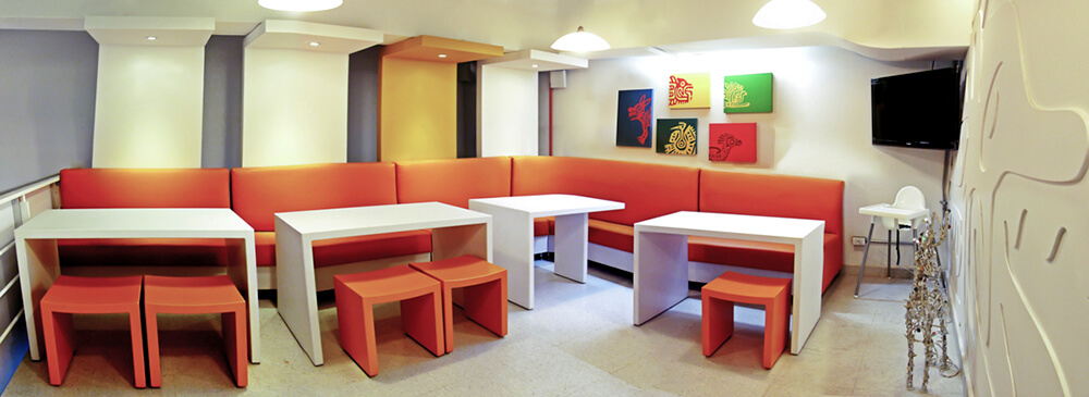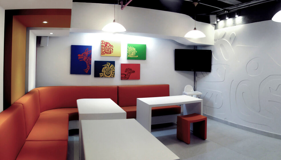 Con pictogramas típicos, como principal recurso gráfico y de identidad, se intervinieron las paredes a través de un impecable corte laser sobre mdf y sellamiento con vinilo acrílico, que dejan ver la cultura mexicana con un alto nivel de sofisticación y dinamismo. Colores vibrantes e intensos para el mobiliario, planeados exclusivamente para lograr un equilibrio general del espacio.