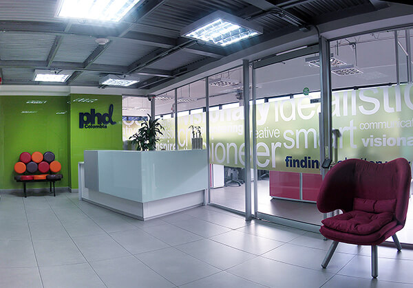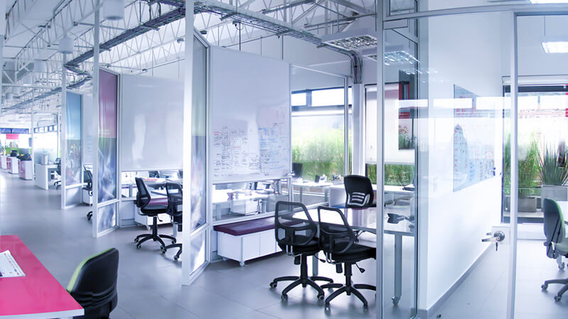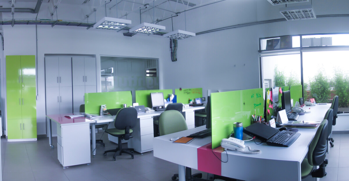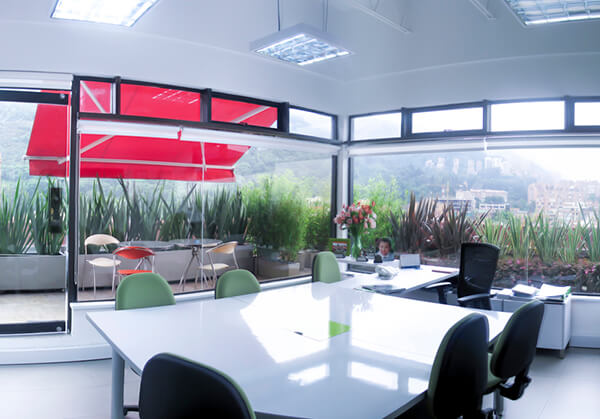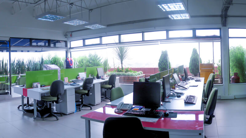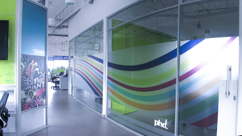 Formas cúbicas para personificar la autenticidad. Divisiones de vidrio que permiten una sensación de libertad y amplitud, además de otorgarle protagonismo a los espacios naturales. Biombos que dividen las salas de juntas y facilitan una distribución adecuada. Vinilos alegres y decorativos que mantienen la privacidad de las oficinas. Techos descubiertos para ganar altura y generar una percepción de naturalidad.