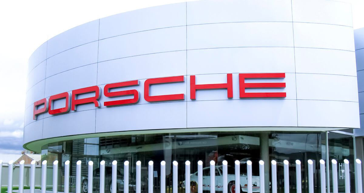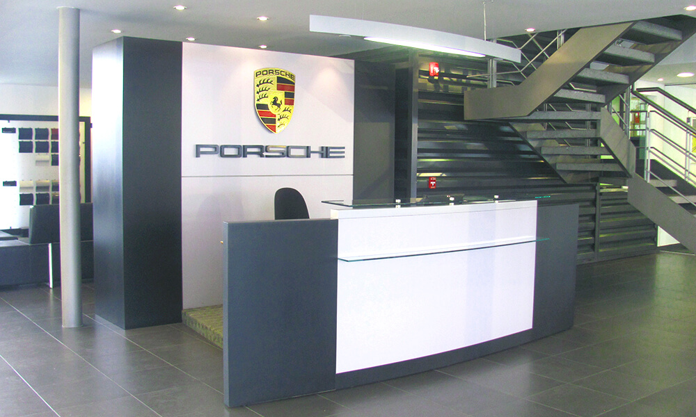 Una persuasiva paleta de colores neutros, propios de la identidad de la marca Porsche, tonos pensados para resaltar los detalles y atributos de los automóviles y los metales de referencia expuestos en la estructura de exhibición.