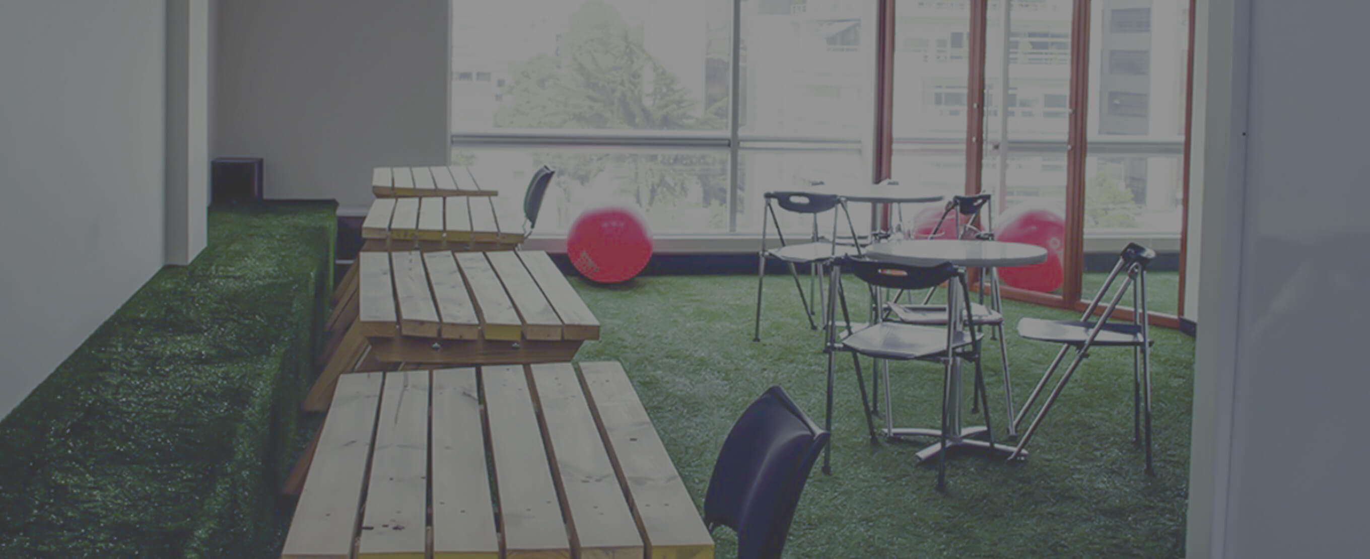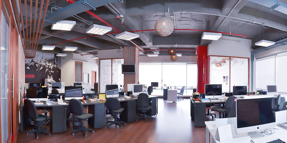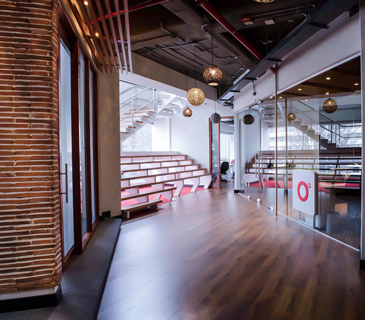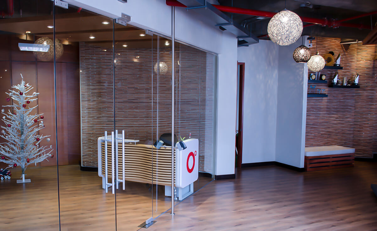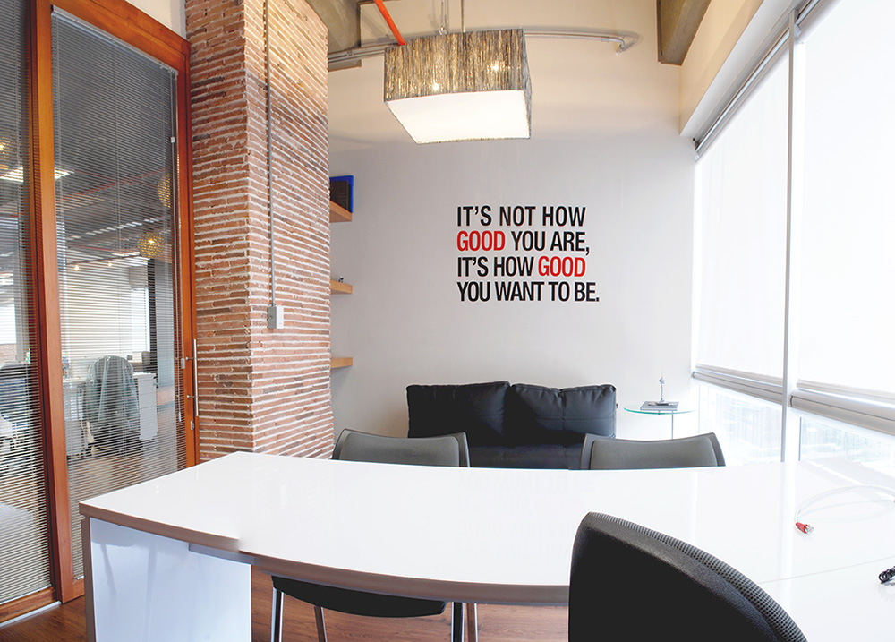 Transfer en los vidrios y columna revestida en pintura acrílica que transmiten la identidad y el lenguaje único de la agencia. Recepción proporcionada, armoniosa y pensada para la mejor “primera impresión”. Acabados de las paredes en vinilo y enchapes en listello; pisos que engalanan cada paso con una combinación en madera y tapete. Escalera con la versatilidad de convertirse en gradería y punto de encuentro.