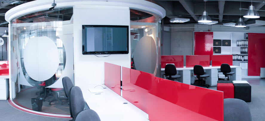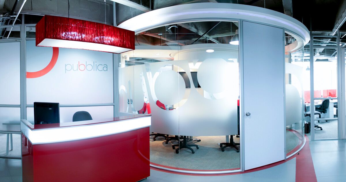 Implementación de formas circulares que obedecen a patrones gráficos de la imagen corporativa; un espacio con la sensación de cápsula, que pasó de ser una sala de juntas, al lugar más deseable de la agencia.