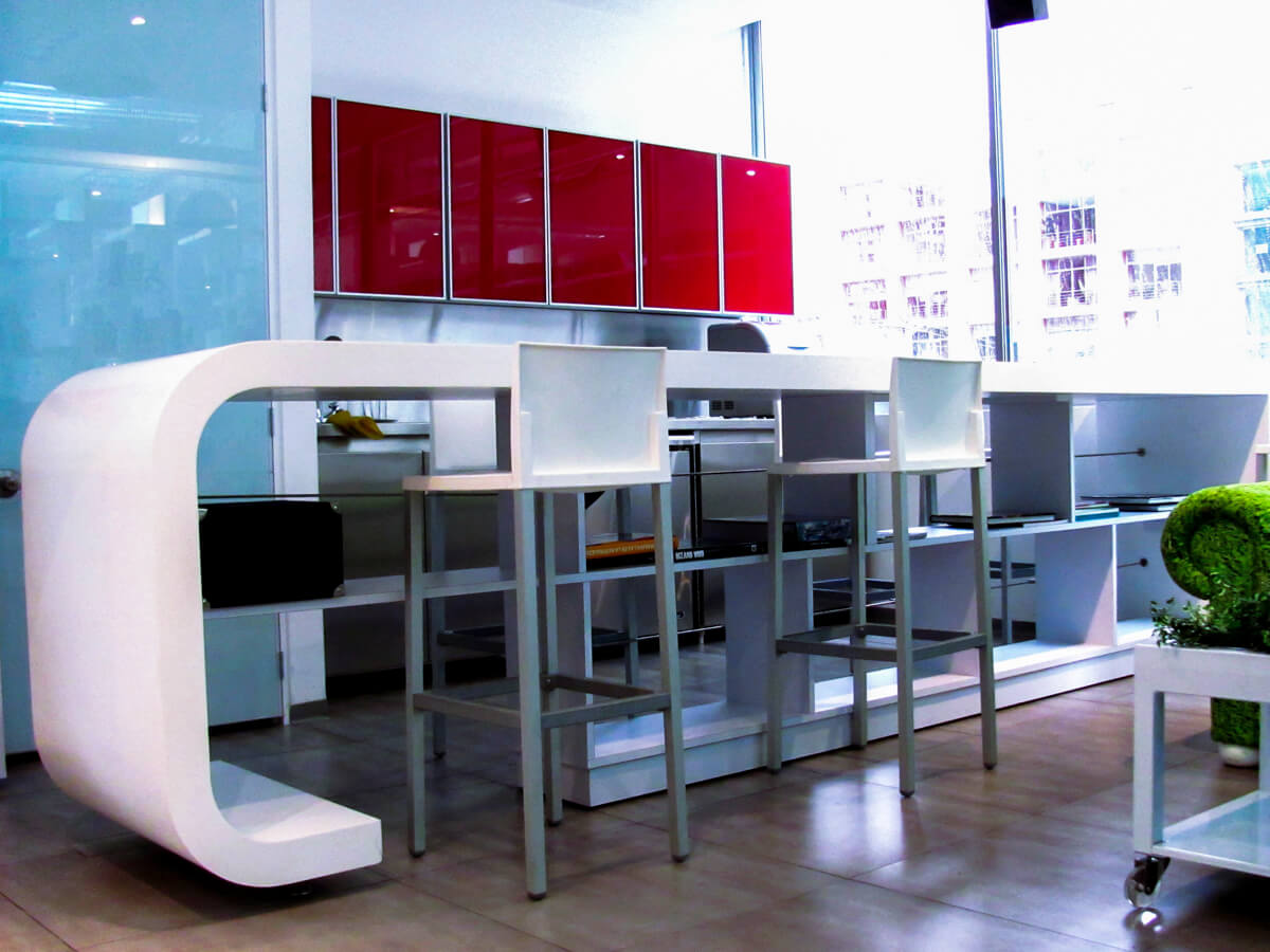 Formas orgánicas en el mobiliario juegan con la combinación de blanco y rojo dan un equilibro al lugar; los detalles en la mesa y librero permiten tener un tiempo perfecto en este espacio.